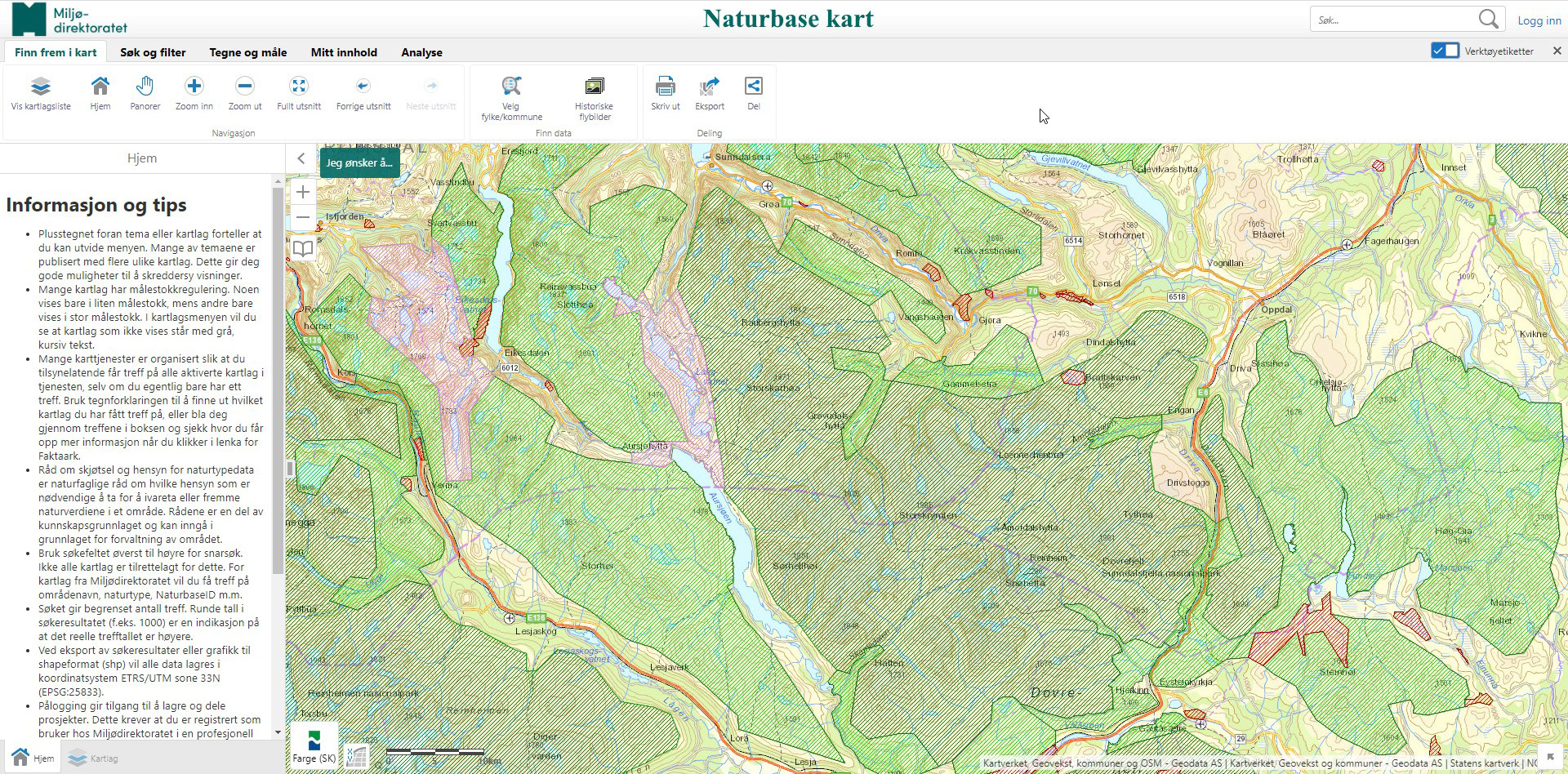 NATUBASEkartet har mange muligheter, se introduksjonen i venstre marg når vinduet åpner. Enda flere muligheter har du i løsninger som GISlink.