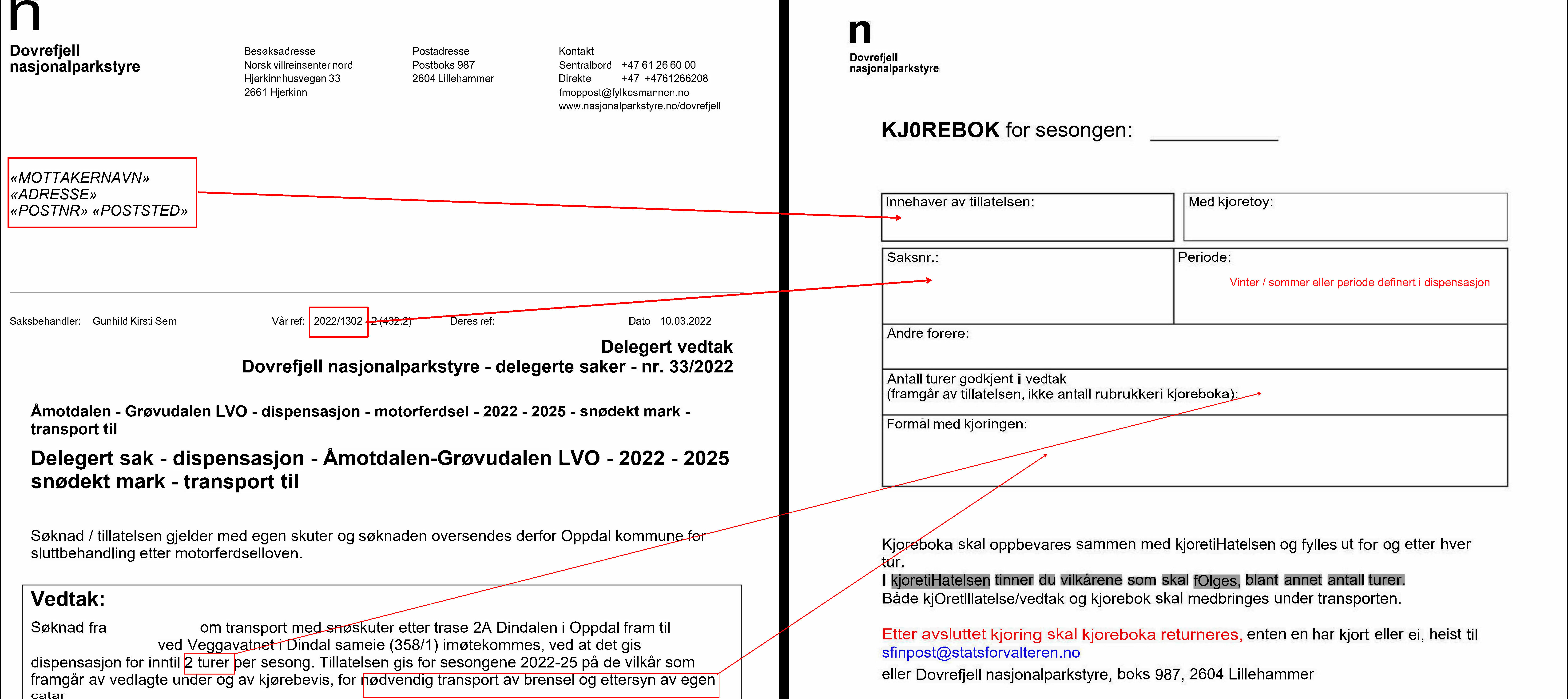 Her ser du hvilke opplysninger fra dispensasjonen som skal hvor i kjøreboka