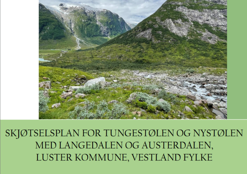 Skjøtselsplan for Tungestølen og Nystølen med Langedalen og Austerdalen i Luster kommune Jostedalsbreen nasjonalparkstyre har fått utarbeidd skjøtselsplan for det særeigne kulturlandskapet rundt Tungestølen og Nystølen i Luster kommune. Nedanfor finn du lenker til skjøtselsplanen. Skjøtselsplan File icon PDF