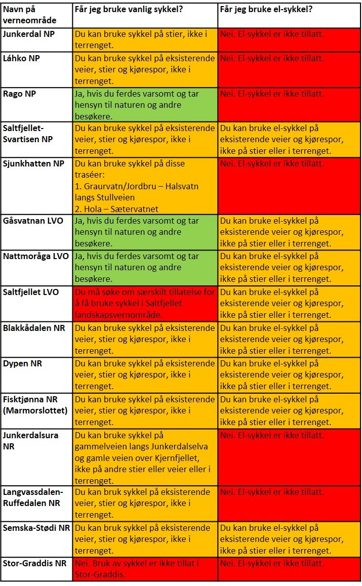 I Rago nasjonalpark, Gåsvatnan og Nattmoråga landskapsvernområder er det ingen begrensninger for bruk av sykkel. I Junkerdal og Sjunkhatten nasjonalpark er det tillatt å sykle på stier og i traséer fastsatt i forvaltningsplanene.