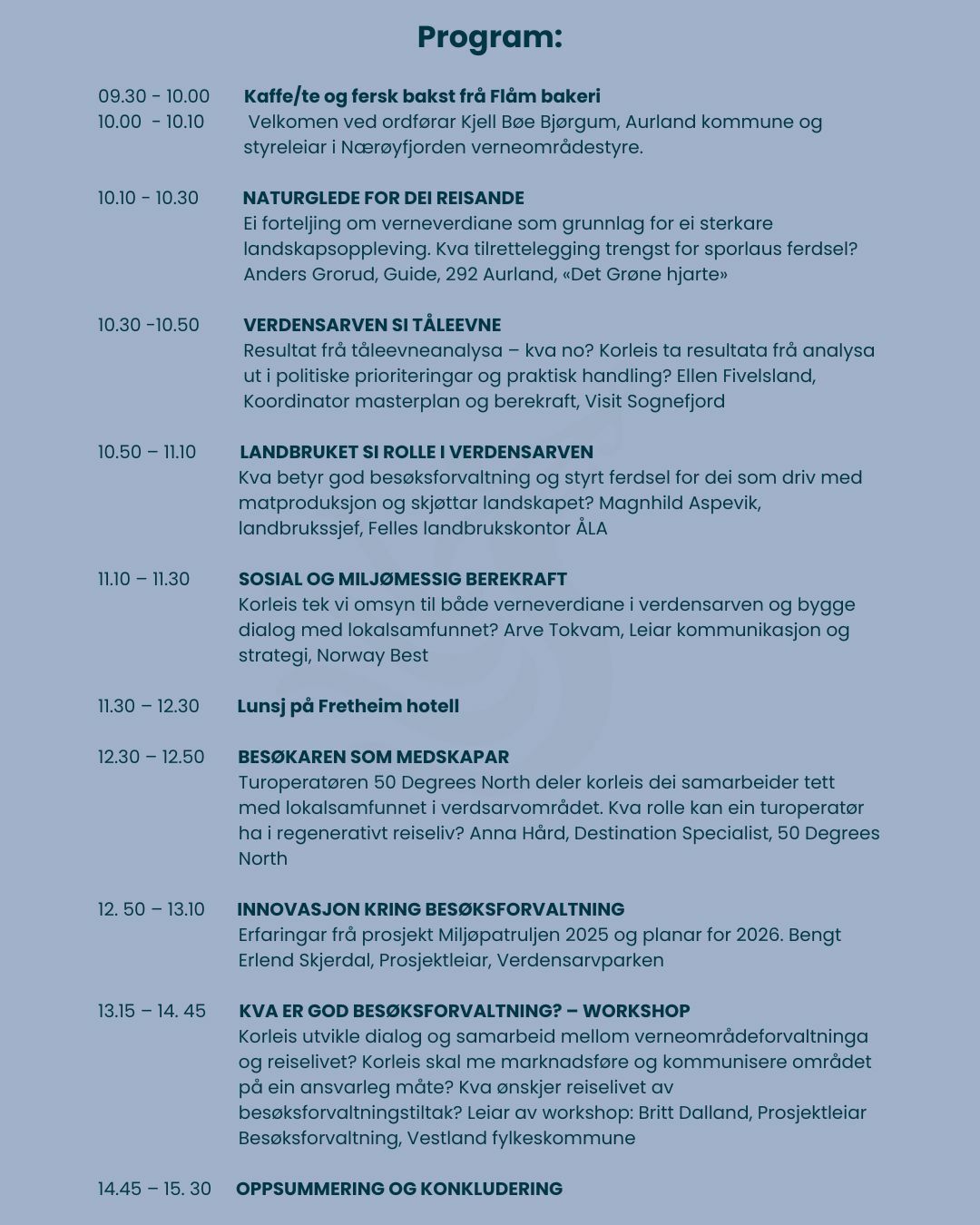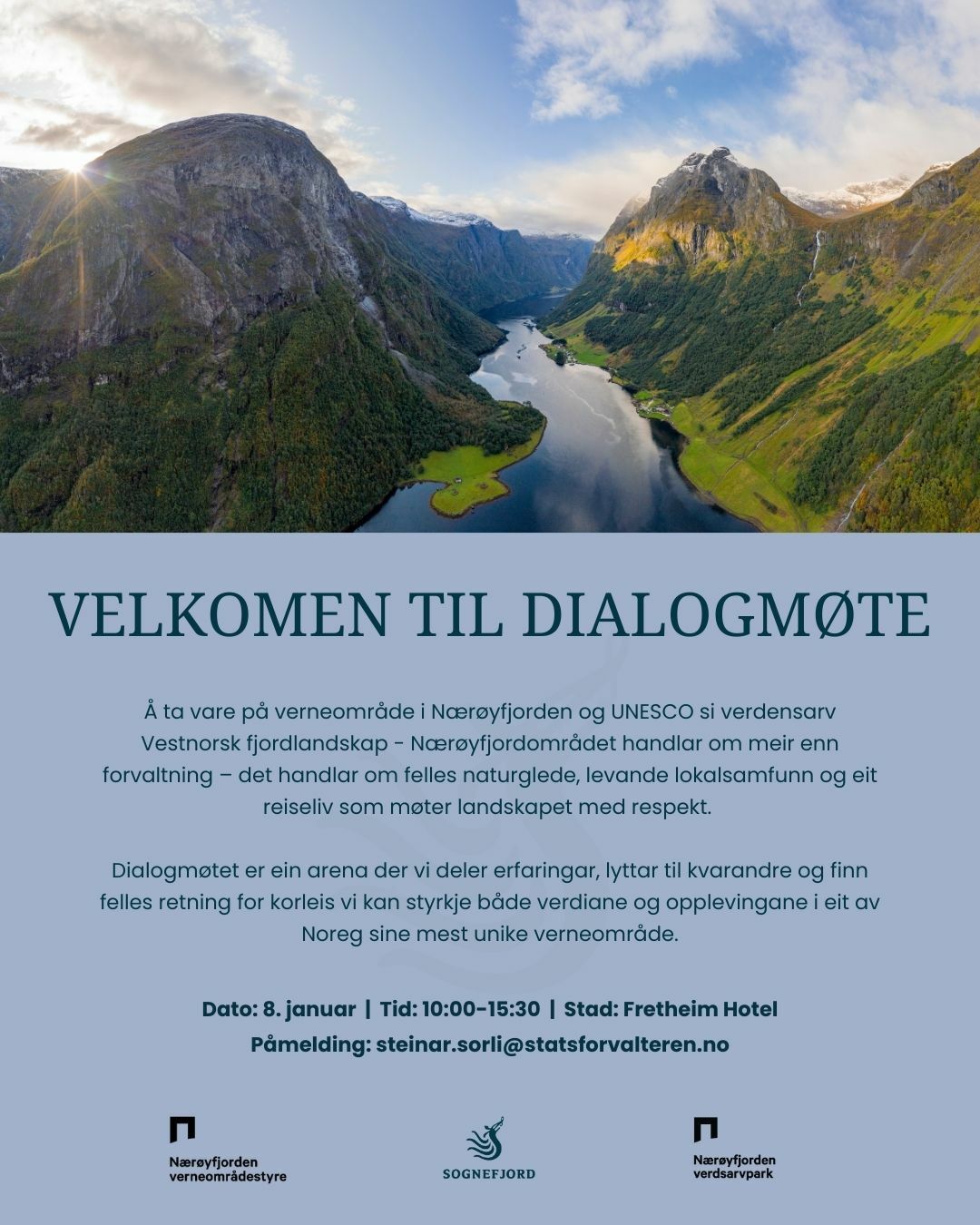 Møtet vil vere ein arena for inspirasjon, deling av erfaringar og utvikling av felles prinsipp for god forvaltning og berekraftig verdiskaping i Nærøyfjorden.