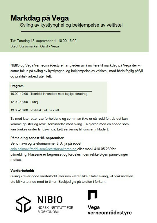 NIBIO og Vega Verneområdestyre har gleden av å invitere til markdag på Vega der vi setter fokus på sviing av kystlynghei og bekjempelse av veitistel, med både faglig påfyll og praktisk arbeid ute i felt.